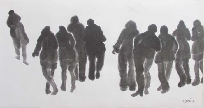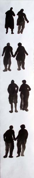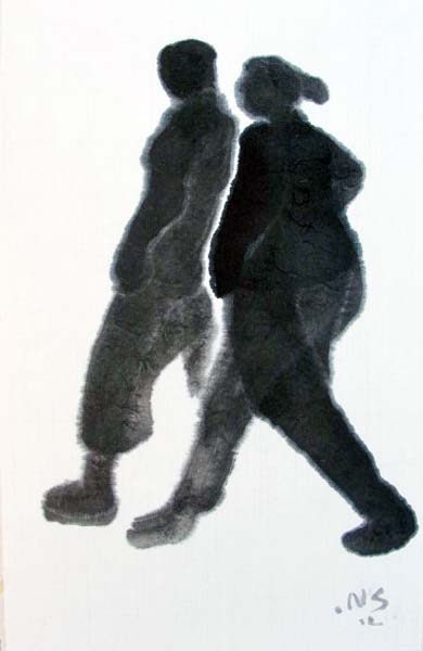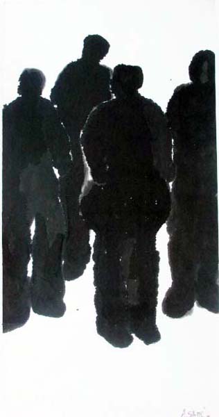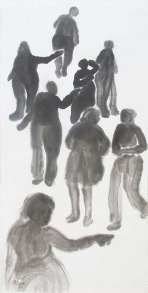 Mon pinceau touche façonne rebondit joue apprivoise aborde le vide, lui donne sens en allant d’un personnage à l’autre.